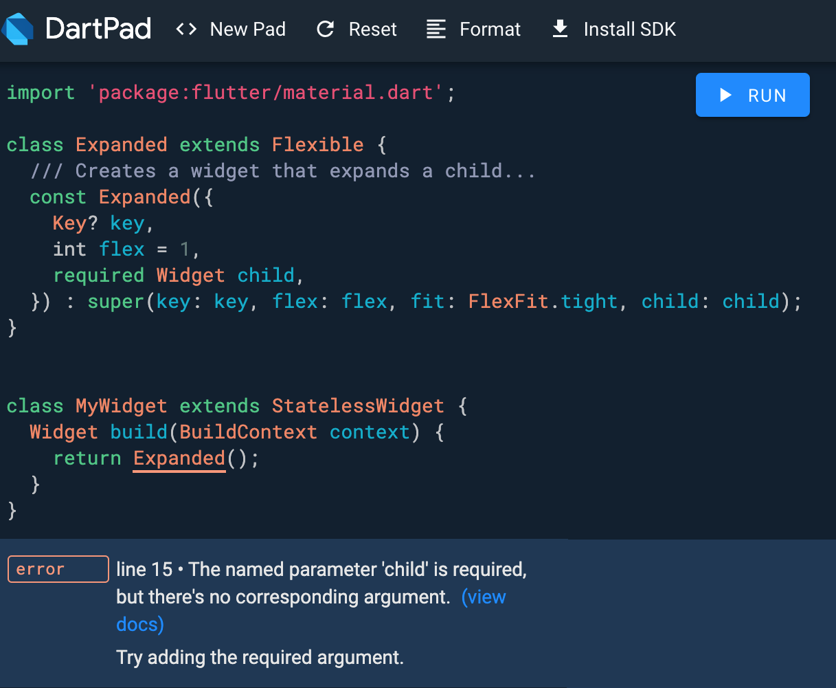 We’ve also added a new keyword, required. When a named parameter is marked as required (which happens a lot in Flutter widget APIs) and the caller forgets to provide the argument, then an analysis error occurs: