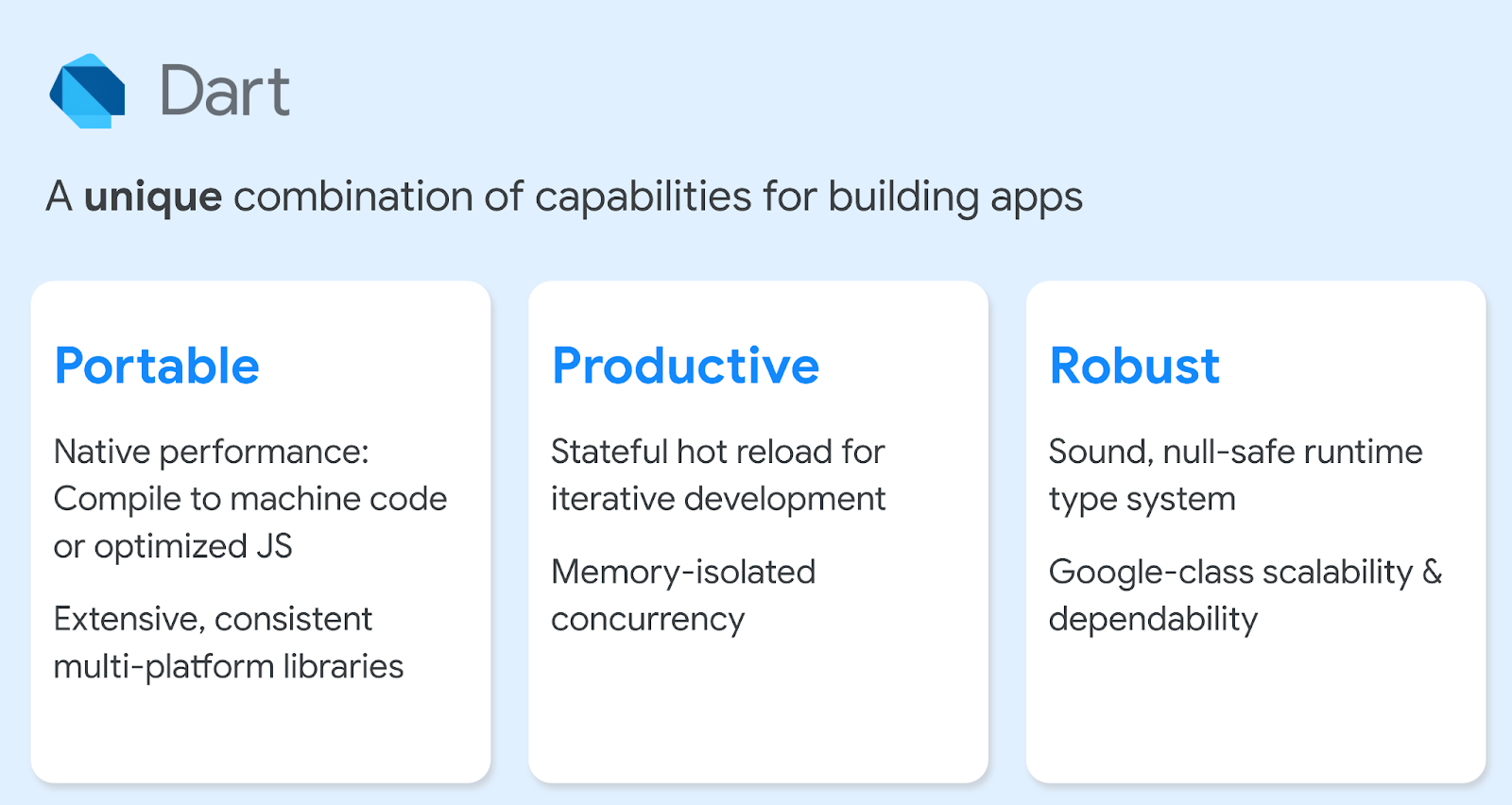 • Robust: Dart’s sound, null-safe type system catches errors during development. And the overall platform is highly scalable and dependable, with production usage for more than a decade by a large range of apps, including business-critical apps such as Google Ads and Google Assistant.