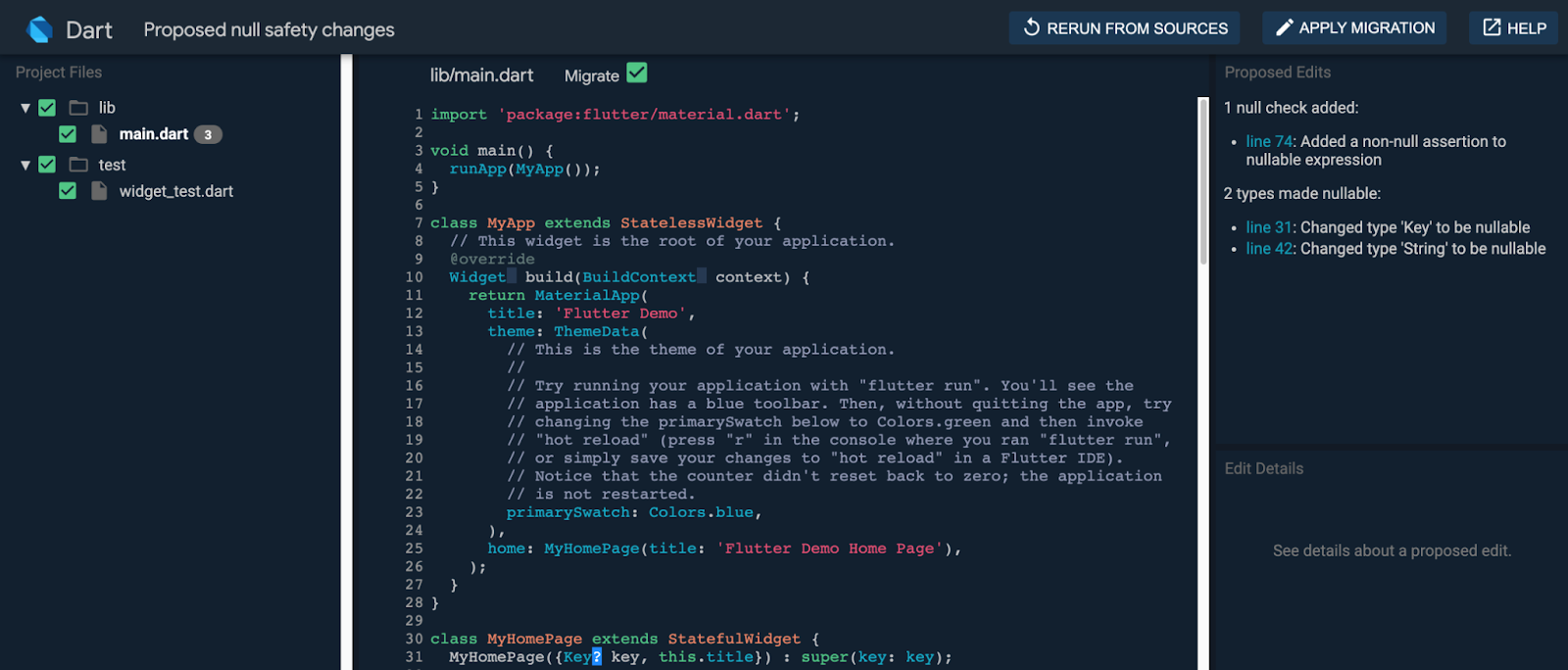 To help you migrate existing code to null safety, we’re providing a migration tool and a migration guide. The tool starts by analyzing all of your existing code. Then you can interactively review the nullability properties that the tool has inferred. If you disagree with any of the tool’s conclusions, you can add nullability hints to change the inference. Adding a few migration hints can have a huge impact on migration quality.