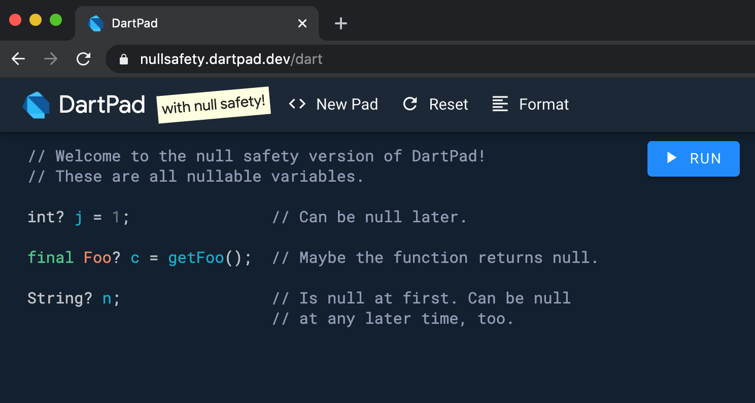 always non-nullable: if you inspect your running code in the debugger, you’ll see that non-nullability is retained at runtime. By contrast, some other implementations are unsound, and in many cases still need to perform runtime null checks. Dart shares sound null safety with Swift, but not very many other programming languages.