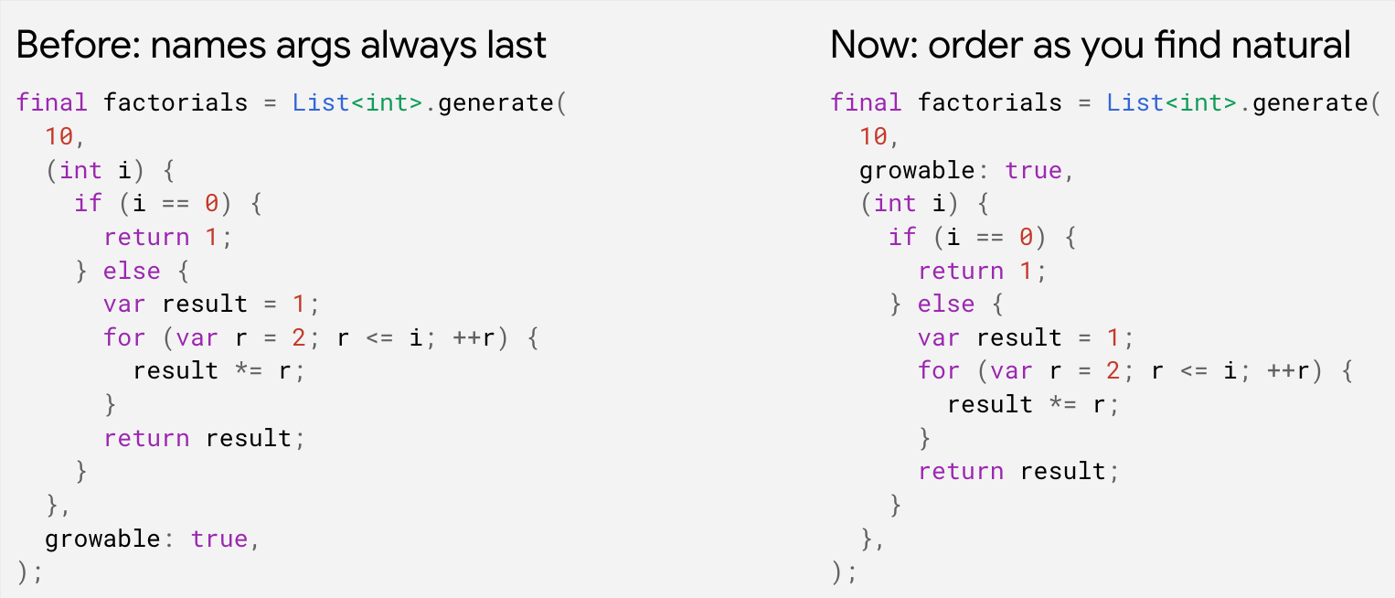 Lastly, we’ve refined how named arguments work when you invoke a method. Previously, these had to appear last in the list of arguments to the method. This was annoying in cases where you’d prefer to place a positional argument last to make the code more readable. For example, see the following invocation of the List<T>.generate constructor — before, the growable argument had to be placed last, making it easy to miss below the large positional argument containing the generator itself. Now you can order them as you prefer, allowing you to place the small named arguments first and the generator last.