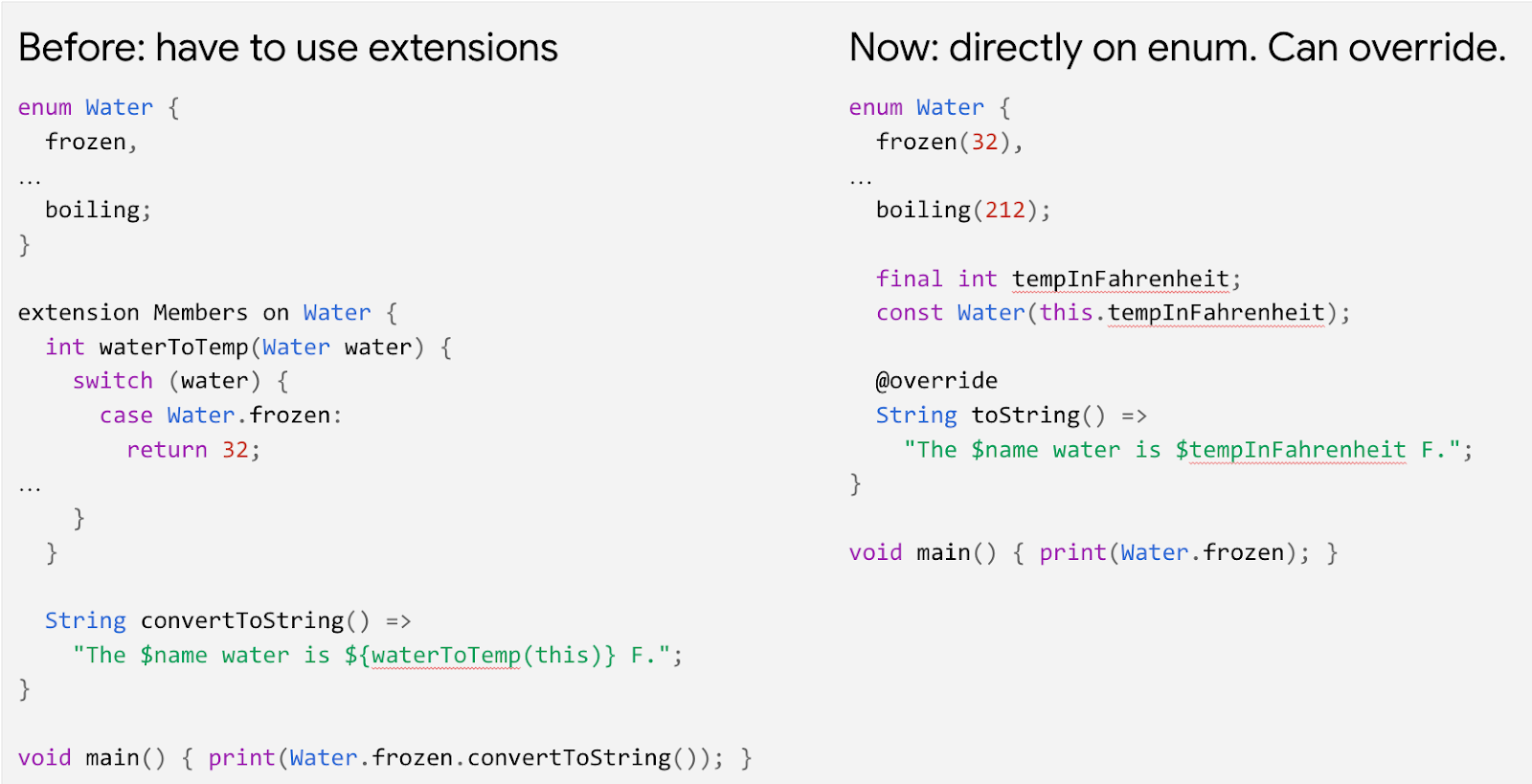 Enums are great for representing a discrete set of states. For example, we might model water as enum Water { frozen, lukewarm, boiling }. But what if we want to add some methods on the enum — for example, to convert each of the states to a temperature, and support converting the enum to a String? We could perhaps use extension methods to add a waterToTemp() method, but we’d have to be careful to keep that in sync with the enum. For the String conversion we’d prefer to override toString(), but that hasn’t been supported.