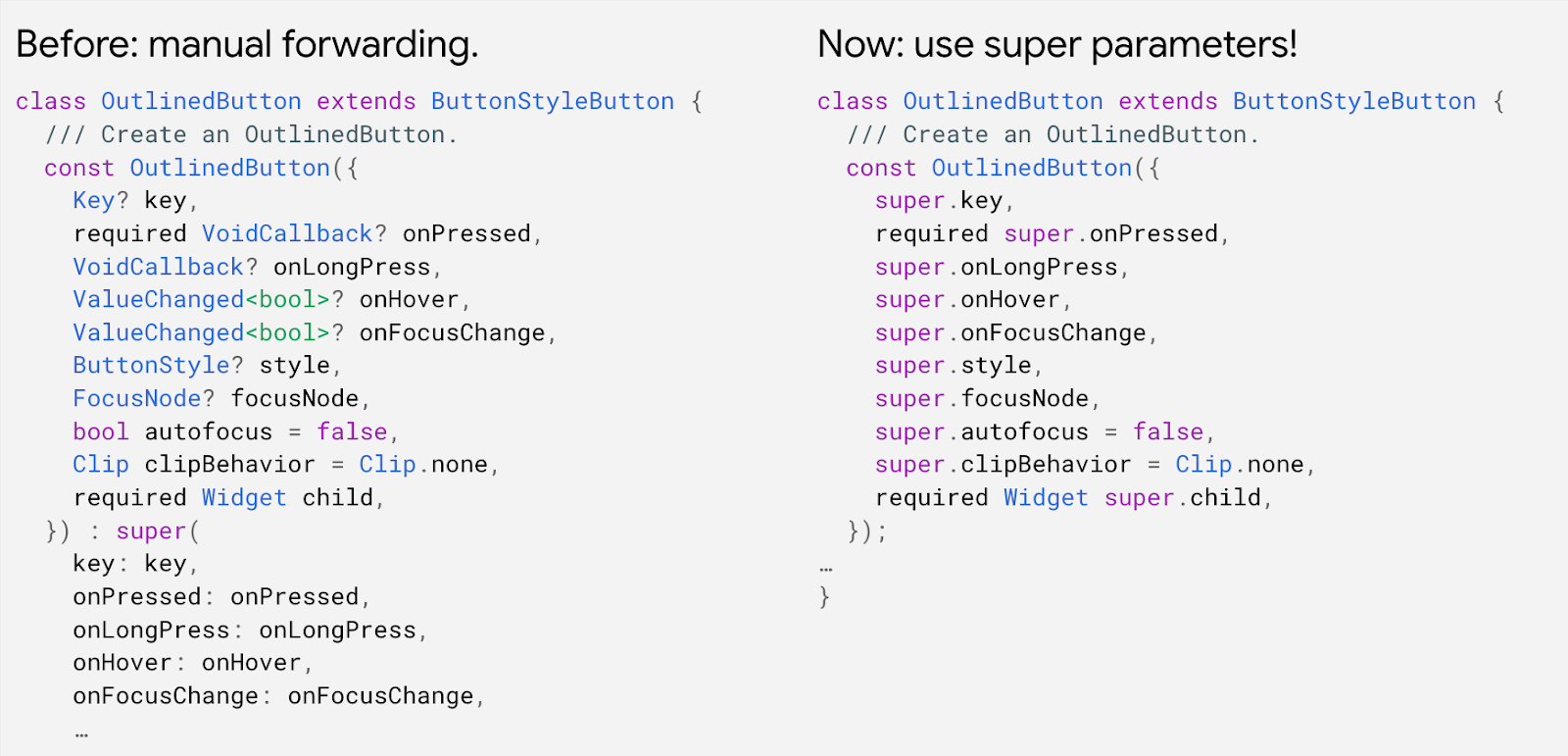 Several Dart community members helped make this happen. GitHub user @roy-sianez filed a language issue regarding this about half a year ago; suggesting something similar to what GitHub user @apps-transround had suggested earlier: that we could perhaps resolve this by introducing a new construct to express that a parameter was specified in the super class. We thought that was a great idea, so this has been added to Dart 2.17. As you can see from the following example, this is especially relevant for Flutter widget code. In fact, when we applied the new feature to the Flutter framework, we saw a total reduction of nearly two thousand lines of code!