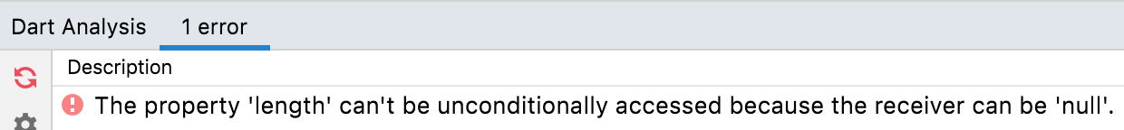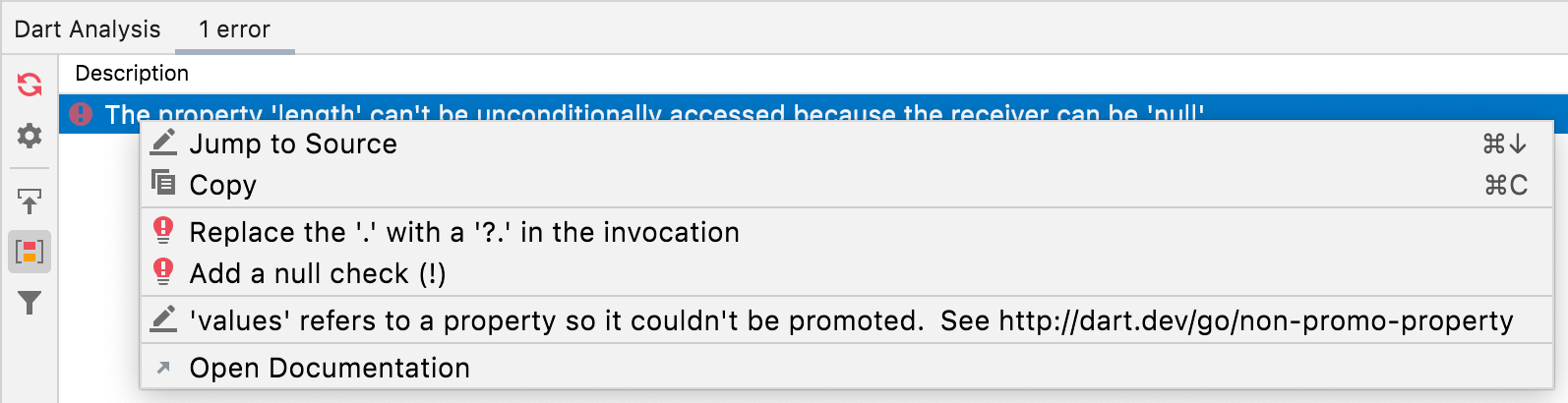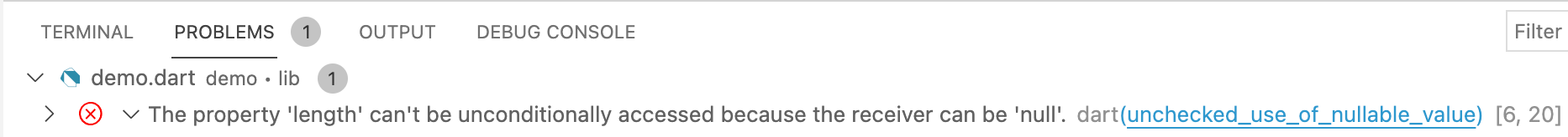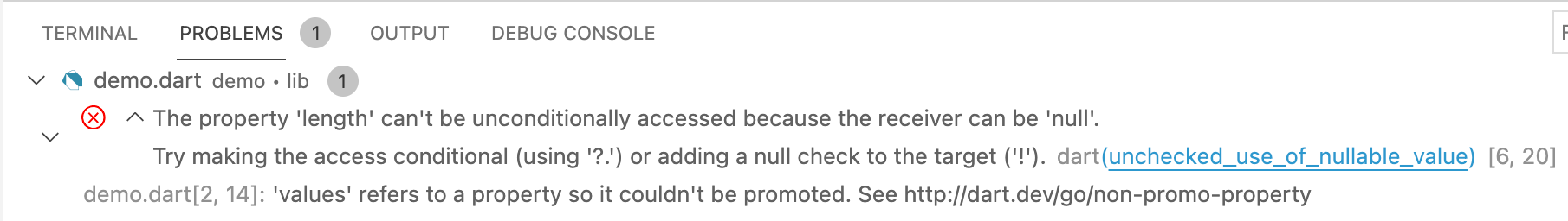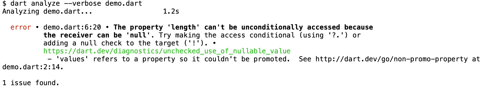 The message tells us what’s wrong, but it doesn’t really help us understand why the check wasn’t sufficient or how to respond to the error. That extra information is actually available; it just might not be obvious how to find it. The rest of this article shows you how to find the location of this extra information in the output of IntelliJ IDEA, Visual Studio Code, and the dart analyze command-line tool.