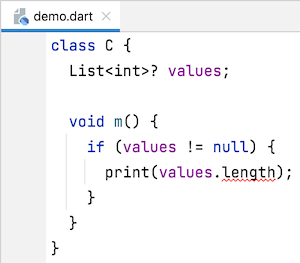 The third line is a context message that explains why the null comparison wasn’t sufficient to promote the type to be non-nullable. Double-clicking the context message navigates you to the declaration of values. The context message includes the URL of additional documentation related to type promotion.