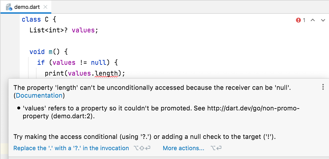 • A context message that explains why the null comparison wasn’t sufficient to promote the type of the property to be non-nullable
