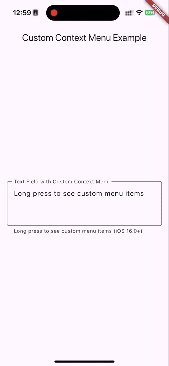 TextField’s contextMenuBuilder property; developers can add menu items with custom titles and callbacks. The implementation bridges Flutter with the native iOS UIMenu system, ensuring custom items integrate seamlessly with standard iOS menu options (copy, paste) while maintaining the native look and feel.