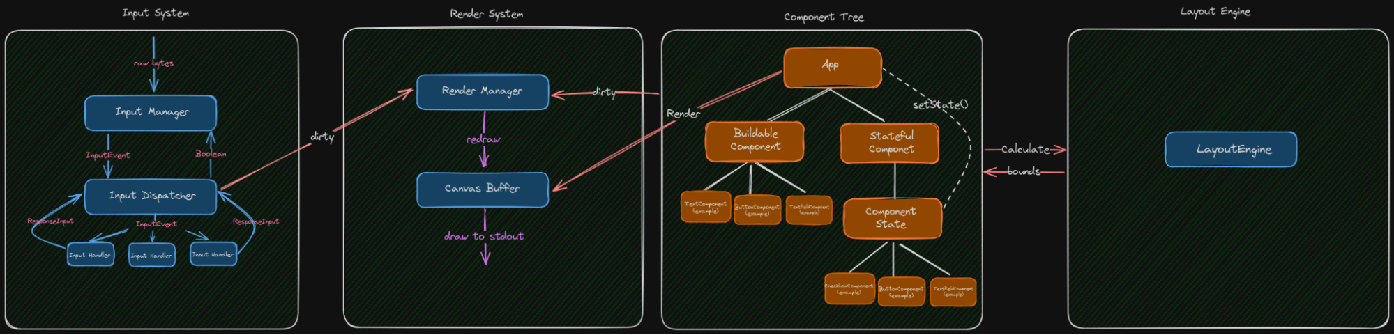 The framework supports stateful and stateless components, input handling, and optimized rendering with double buffering and ANSI diffing. This improves performance by minimizing terminal redraws and enables reliable golden testing with a virtual terminal interpreter.