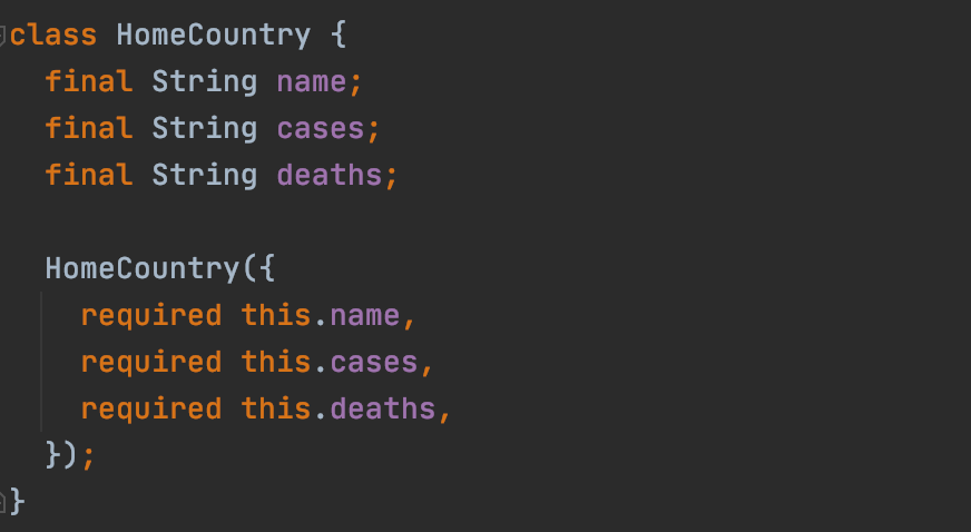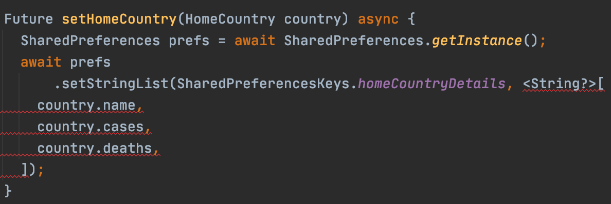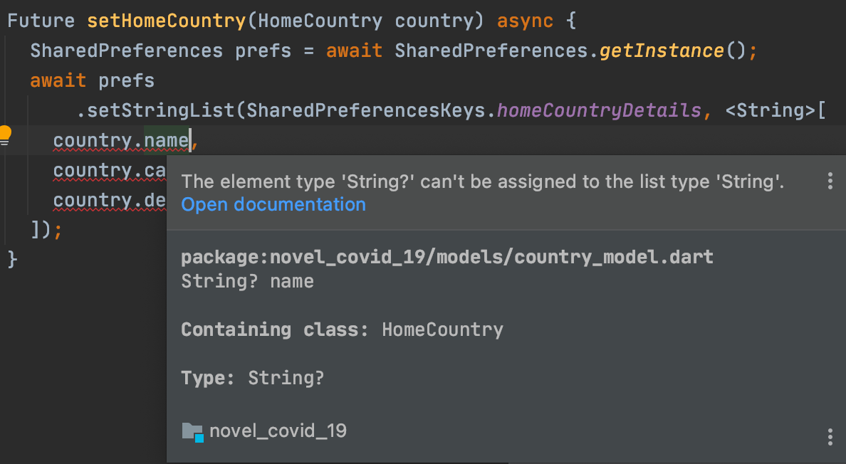 To resolve the problem, I made each property of HomeCountry class non-nullable and added a required keyword in the constructor. That meant it was now necessary to pass the arguments while initializing HomeCountry. I didn’t have to change the setHomeCountry function because the variables being passed to the list were now non-nullable.