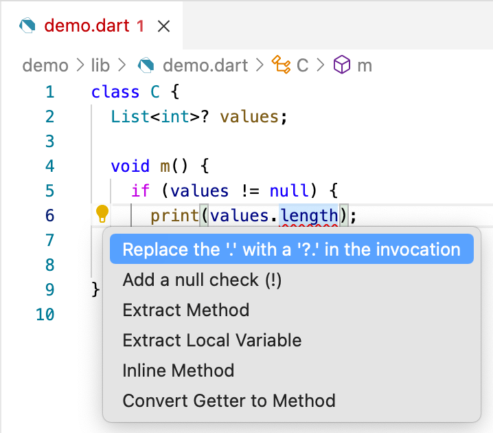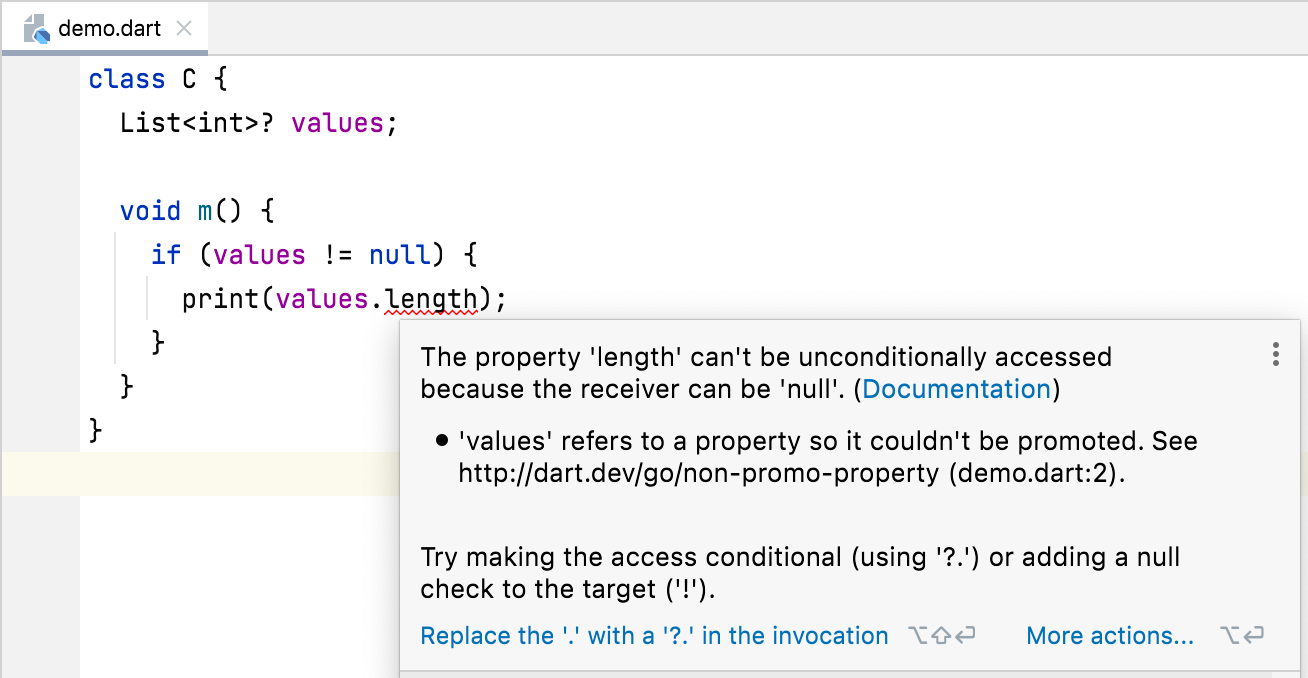 The correction message suggests two ways of resolving the problem: “Try making the access conditional (using ‘?.’) or adding a null check to the target (‘!’).”