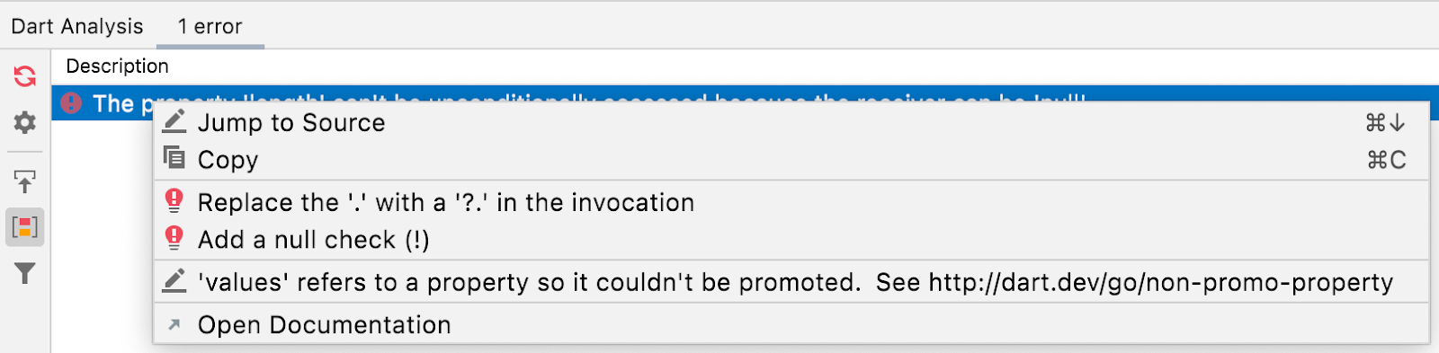 If that’s not enough, you can also invoke the available fixes from the context menu in the Dart Analysis view: